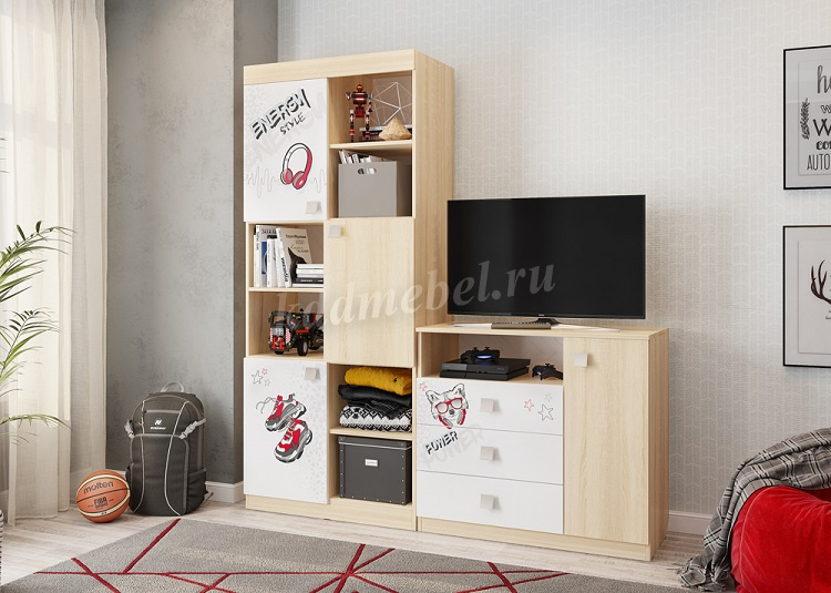 Стильный комод «Энерджи» – мечта каждого подростка. В 3-х выдвижных ящиках и 2-х удобных закрытых нишах за одним фасадом можно разместить все вещи подростка. Эффектный принтерный рисунок на фасадах выдержан в общем стилистическом решении. Рисунок устойчив к истиранию и ультрафиолету. Детская «Энерджи»- все, что нужно для подростка!