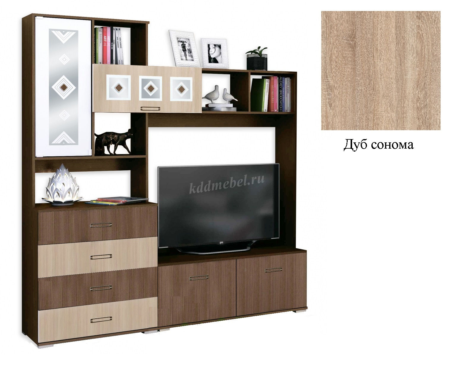 Стильная и компактная центральная секция Яна порадует Вас своей функциональностью и интересным сочетанием расцветки. Индивидуальность придают оригинальные зеркальные вставки на дверцах. Подойдет для установки телевизора, имеет открытые ниши для фотографий и сувениров, закрытые полки и выдвижные ящики для хранения вещей. Секция может компоноваться шкафом модульной гостиной Яна.
