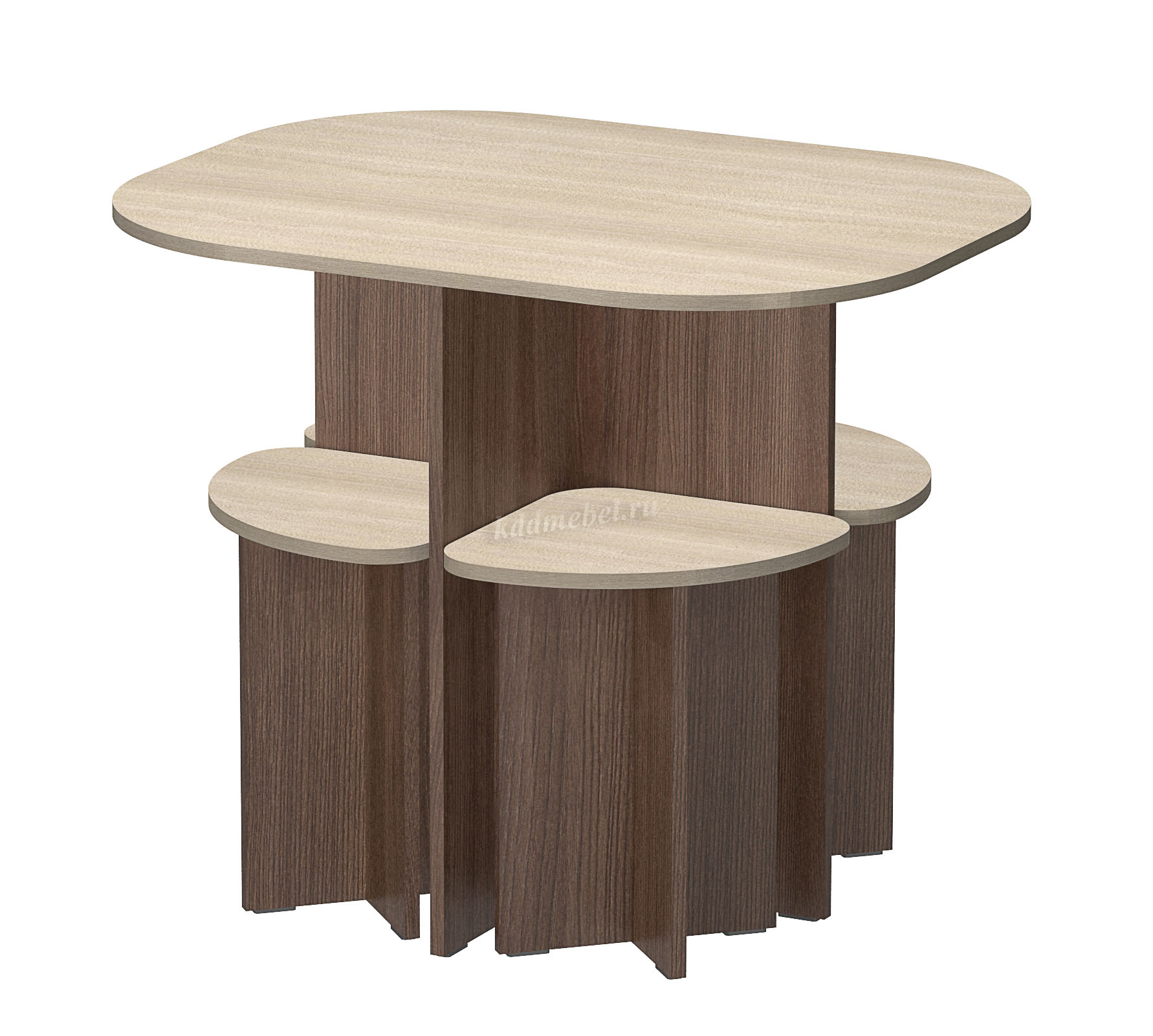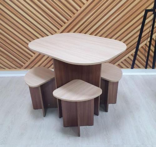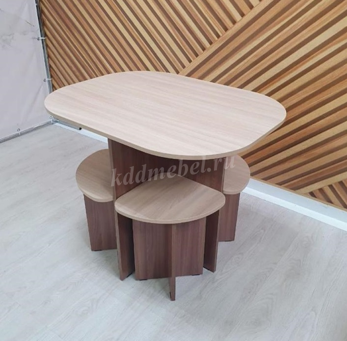 Компактный и функциональный набор мебели состоит из стола и 4-х приставных табуретов.