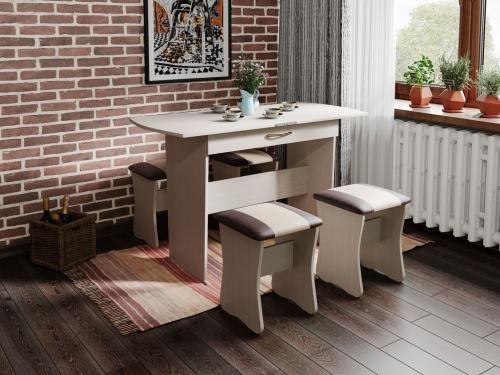 Обеденная группа «Тип 2» станет уютной обеденной зоной для вас и ваших гостей. Встроенный механизм трансформации позволит увеличить ширину обеденного стола с 750 мм до 1200 мм. Мягкие сиденья табуреток повышают уровень комфортабельности.