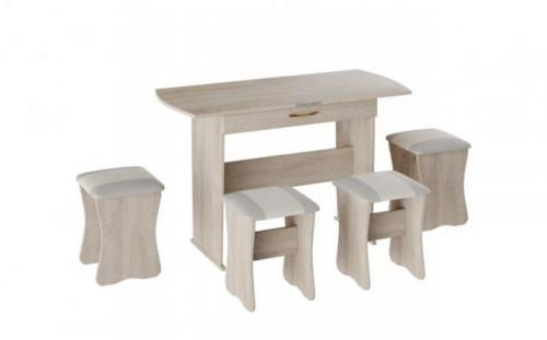 Обеденная группа «Тип 2» станет уютной обеденной зоной для вас и ваших гостей. Встроенный механизм трансформации позволит увеличить ширину обеденного стола с 750 мм до 1200 мм. Мягкие сиденья табуреток повышают уровень комфортабельности.