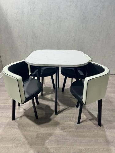 Описание Обеденная группа DT/DC-804 (Белый мрамор/Бело-черный/Каркас черный)