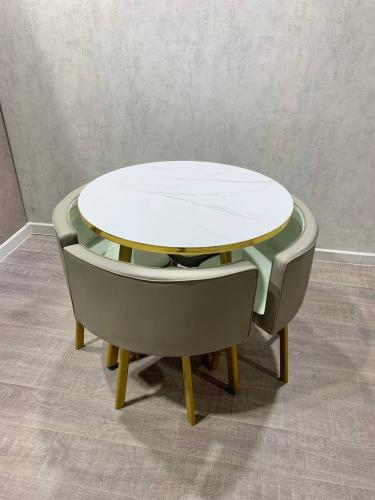 Описание Обеденная группа DT/DC-805 (Белый мрамор/Светло-серый/Каркас золотой)