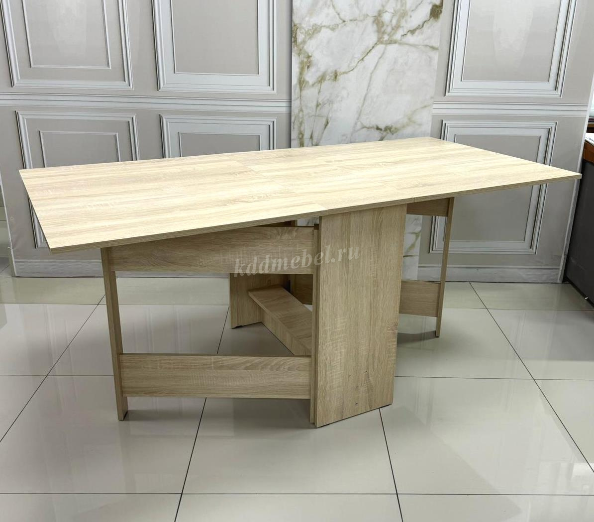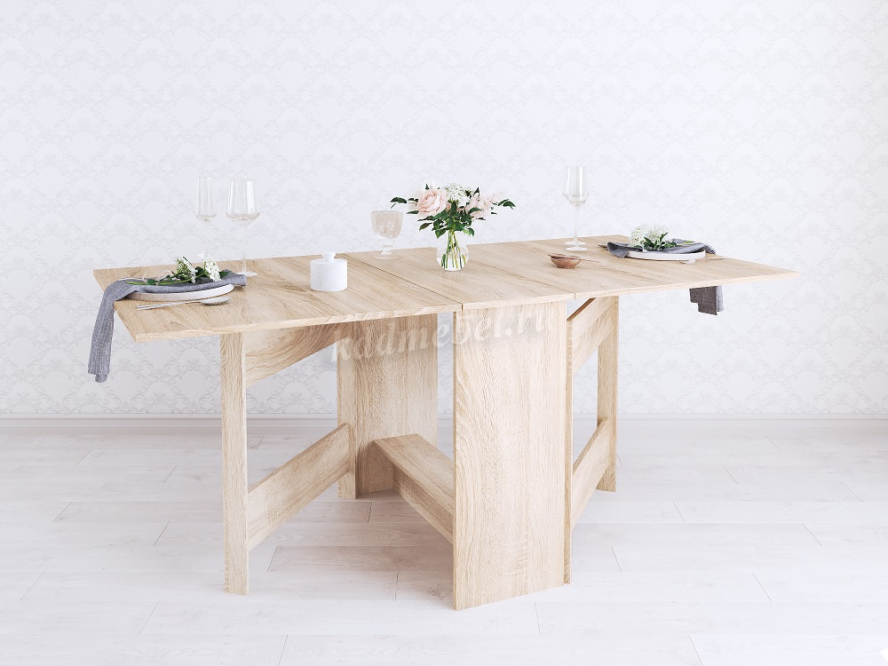 Стол имеет 3 положения: полностью сложенный, разложенный наполовину или полностью разложенный.